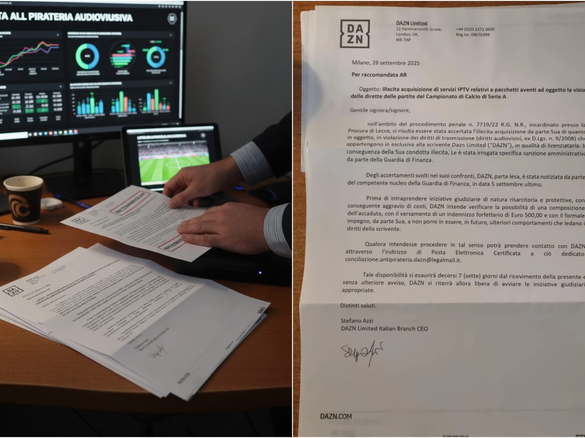 DAZN hat begonnen, Briefe an Hunderte von Benutzern zu senden, die als Benutzer des sogenannten Pezzotto, das illegale IPTV-System, über das Sportveranstaltungen ohne Abonnement angesehen werden können. In seiner Mitteilung fordert das Unternehmen eine Zahlung von 500 Euro, um „weitere rechtliche Schritte“ und eine mögliche Zivilklage zu vermeiden. Die Angelegenheit sorgt für Diskussionen: Viele Nutzer, unter anderem auf Reddit, fragen sich, ob DAZN diese Zahlung wirklich verlangen kann und welche Risiken für die Empfänger des Briefes bestehen.