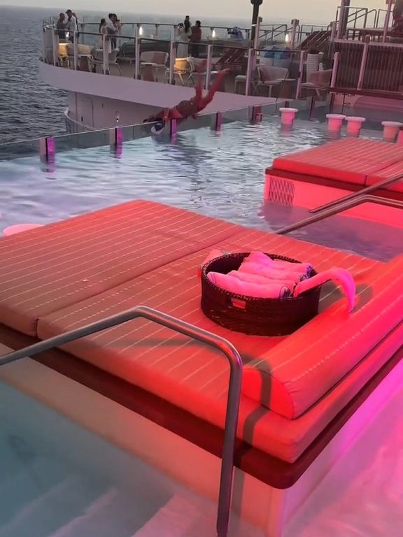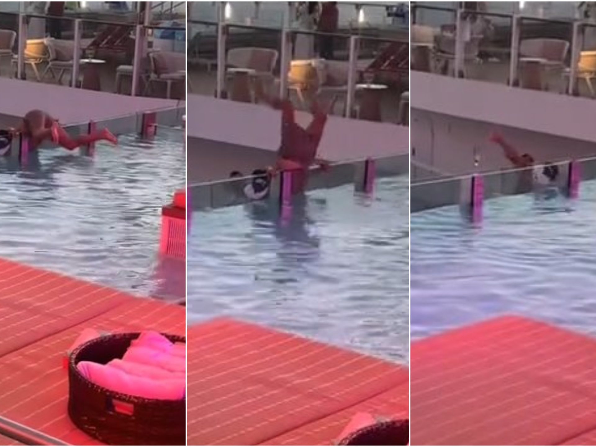 Al hacerlo, perdió el equilibrio y cayó en la zona de seguridad justo debajo de la piscina: una pasarela técnica aislada del público. El acto, también grabado en video por otros pasajeros, provocó pánico momentáneo entre los pasajeros, pero no le causó lesiones físicas. La aerolínea confirmó que el pasajero no reportó lesiones y no requirió atención médica.