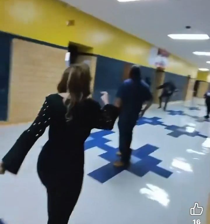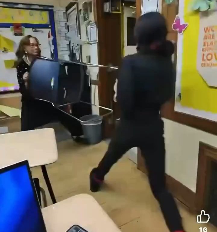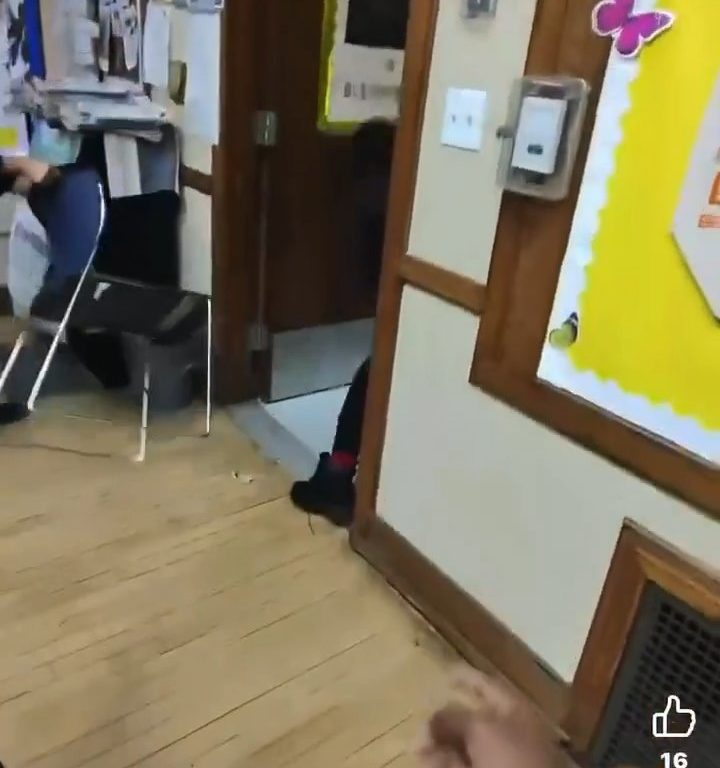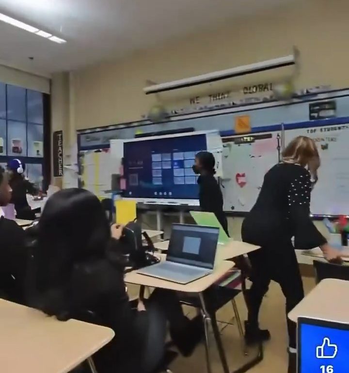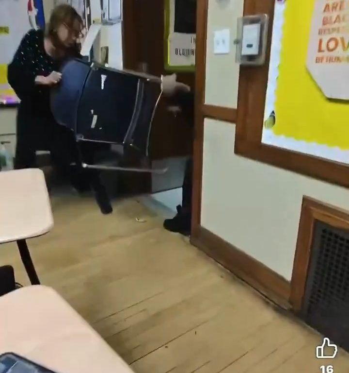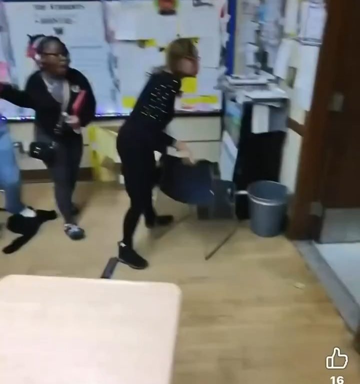 El video muestra a la maestra agarrando una silla y usándola como barrera, empujándola hacia la estudiante armada para mantenerla a raya. Esta acción le permite escapar. Durante un intercambio frenético, el cúter cae al suelo, pero la estudiante lo recupera rápidamente y huye del aula por el pasillo de la escuela.