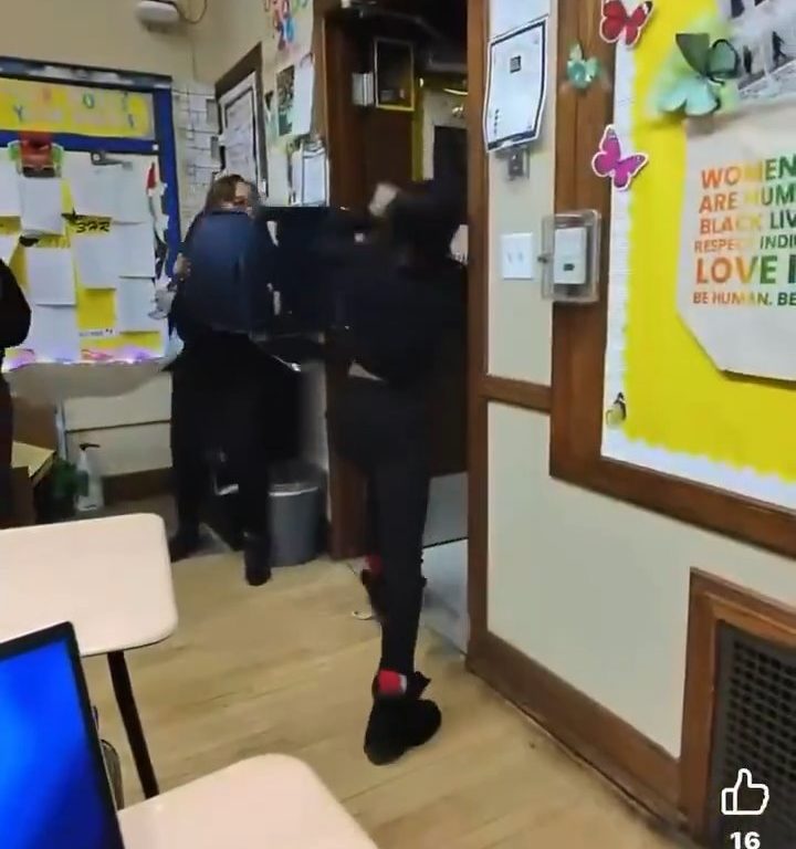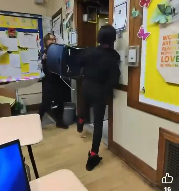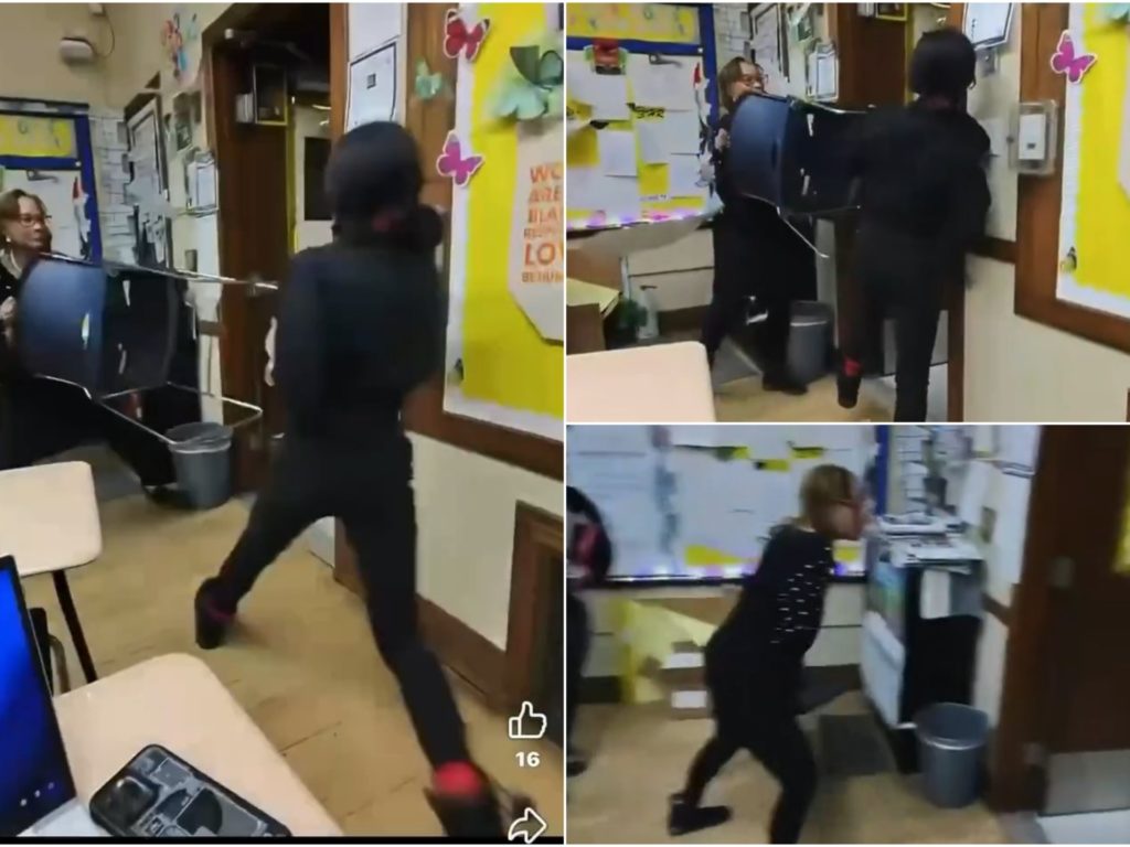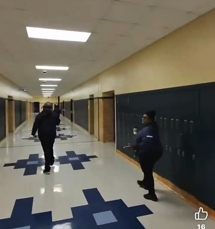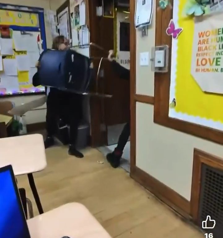 El video muestra a la maestra agarrando una silla y usándola como barrera, empujándola hacia la estudiante armada para mantenerla a raya. Esta acción le permite escapar. Durante un intercambio frenético, el cúter cae al suelo, pero la estudiante lo recupera rápidamente y huye del aula por el pasillo de la escuela.