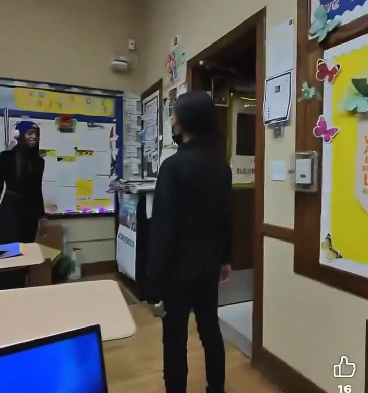 Las imágenes muestran claramente la dinámica del ataque. Una niña entra al aula con el objeto punzante en la mano y se acerca rápidamente a su compañero, obligándolo a retirarse. En ese momento, el profesor presente intenta intervenir entre los dos estudiantes, primero intentando alejar al niño amenazado y luego impidiendo que la niña continúe el ataque.