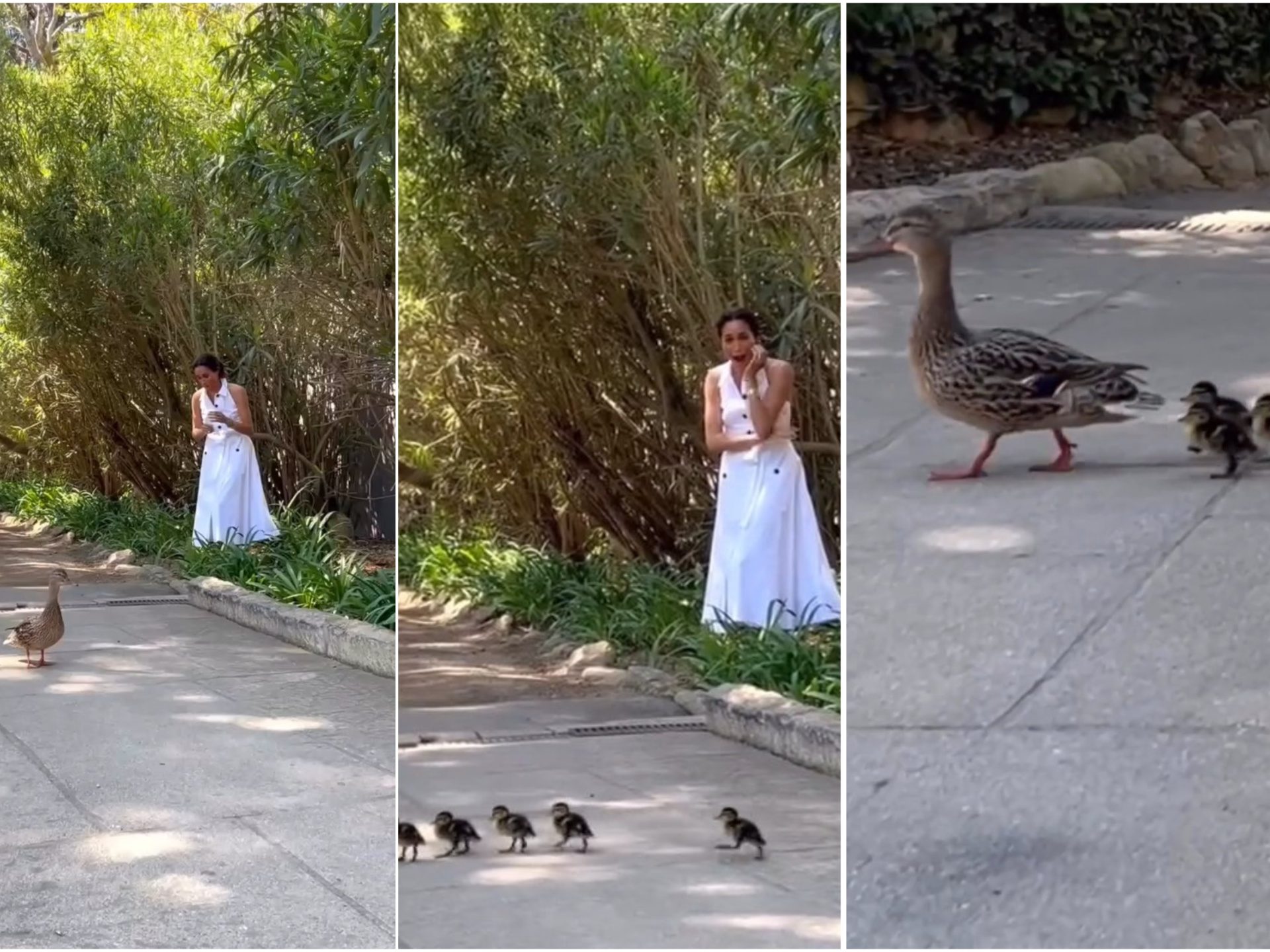 Meghan Markle a partagé un moment de Pâques doux et inattendu dans le jardin de sa villa à Montecito, en Californie. La duchesse de Sussex a été surprise par un visiteur inhabituel : une mère cane suivie d'une ribambelle de canetons mignons a traversé l'allée du domaine, laissant Meghan amusée et enchantée.